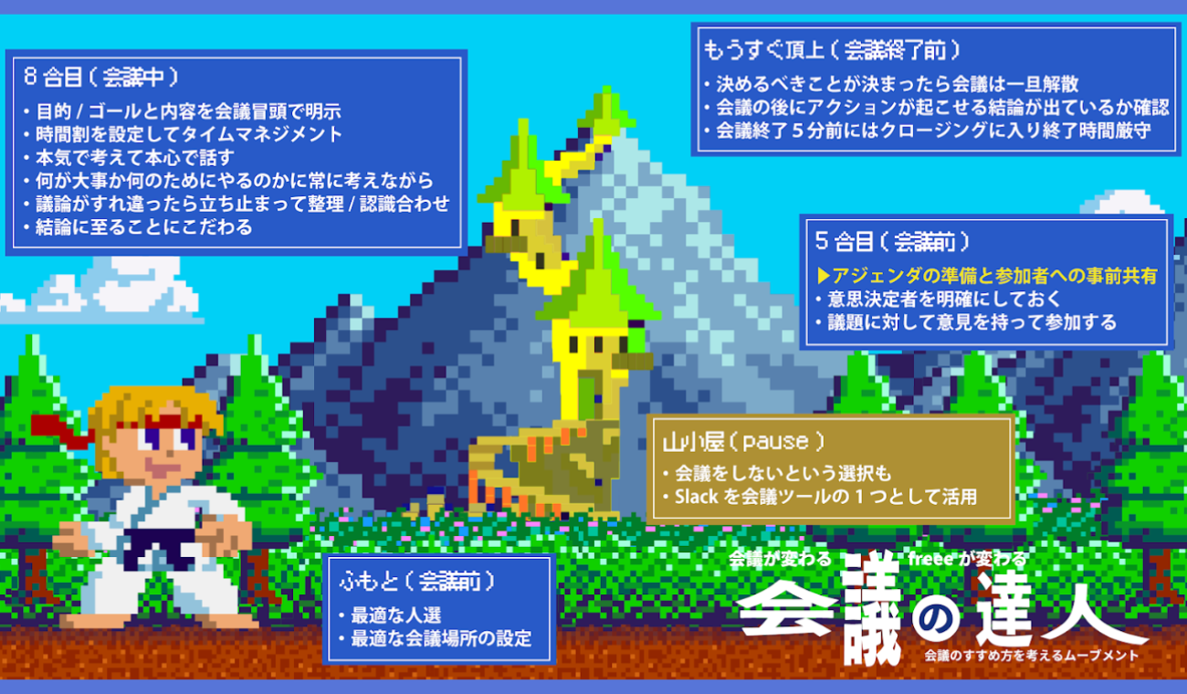 さらに、会議自体の効率化や時間短縮を狙い、社内の「会議の達人」にインタビューしTipsを共有する連載記事を総務から発信し、まとめたTipsを会議室内のモニターに掲示するなどの啓発活動も実施。
