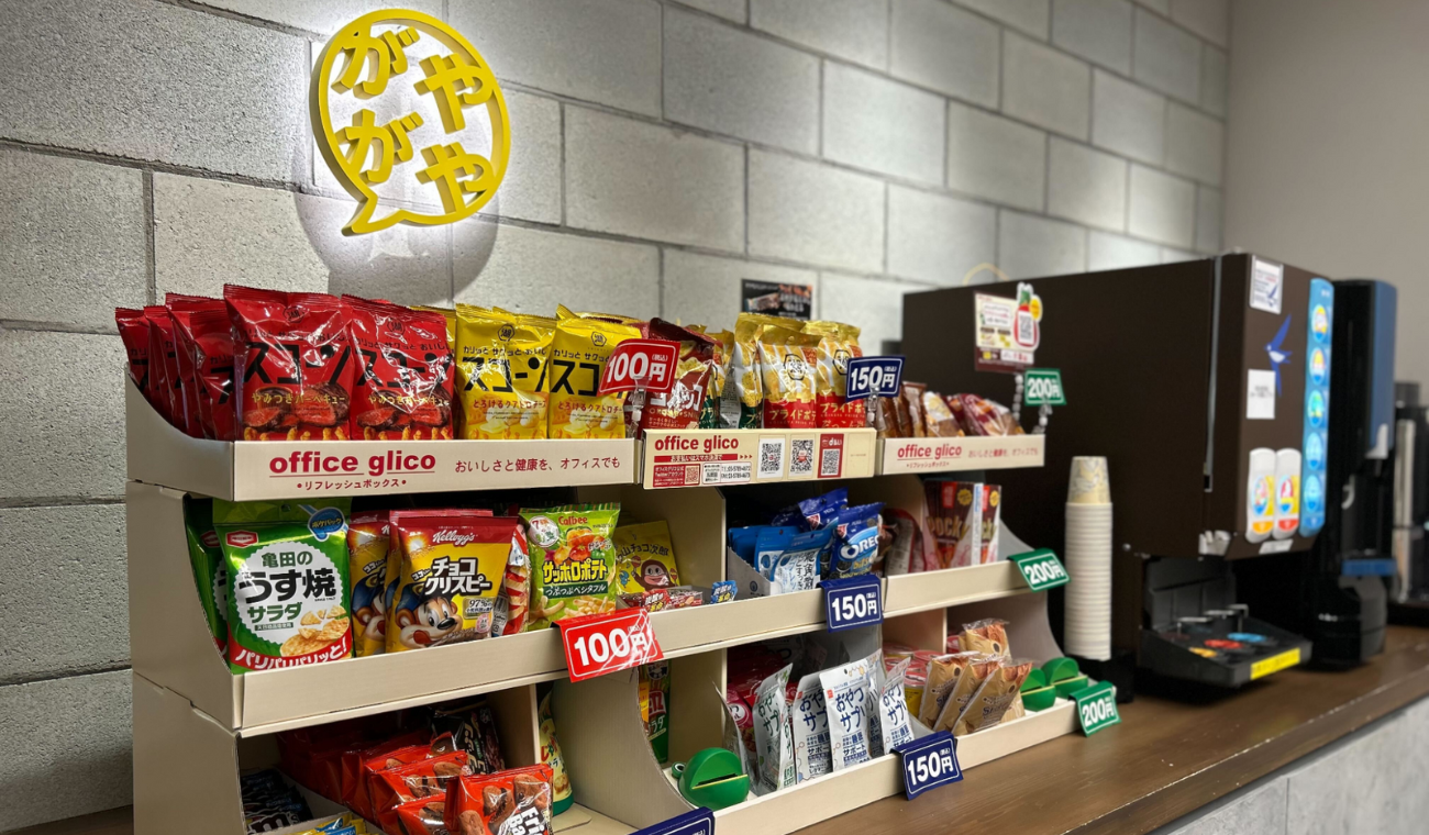 移転した大崎エリアは飲食店が少なかったため、オフィス内で手軽に食事が取れるよう整備。牛丼自販機の設置に加え、お弁当販売を複数社に依頼し飽きないラインナップに。並行して従業員が自由におすすめ飲食店を入力できるランチマップをGoogleマップで作成し全社に共有。軽食コーナーや軽食自販機も増設し残業時のエナジーチャージをサポート。