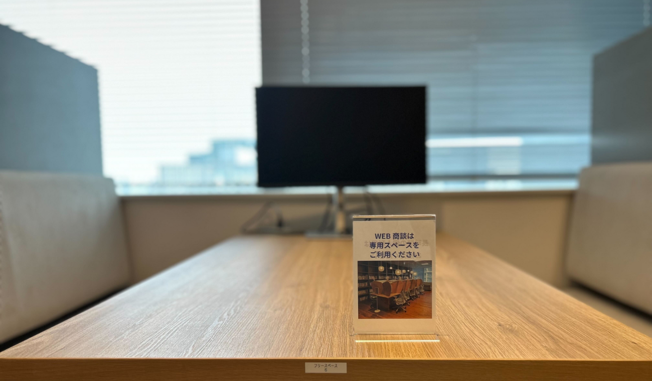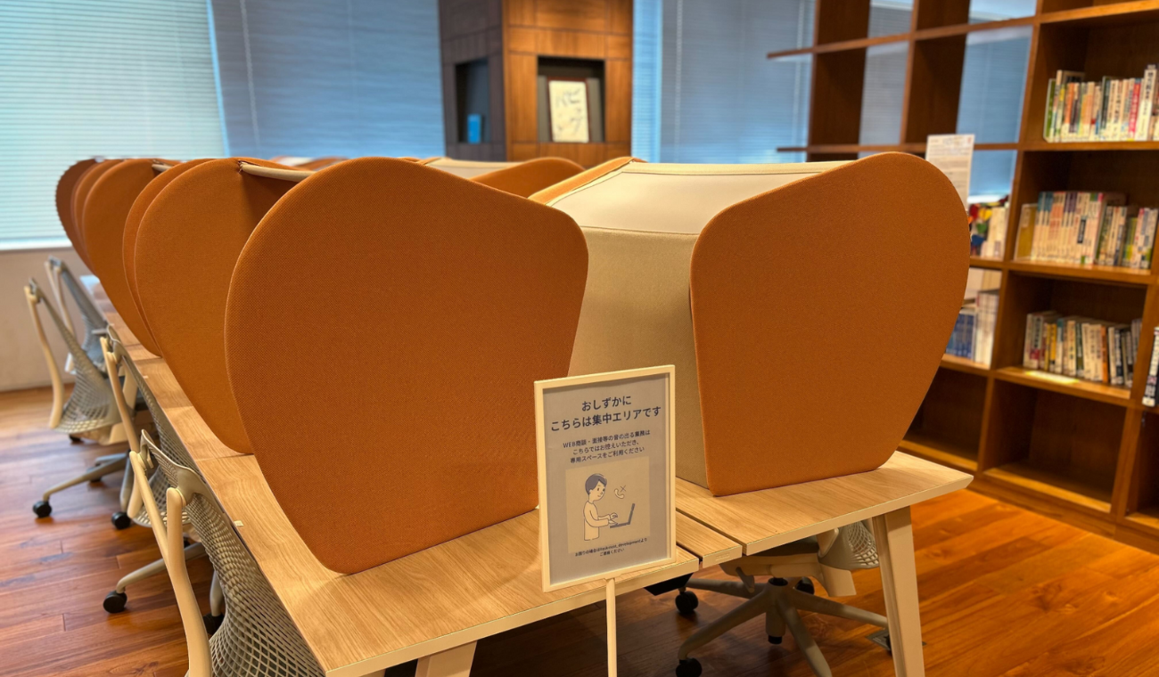 静かに作業できる「集中スペース」を一角に設置。簡易なパーティションと音対策で、気軽に使える場所に。また集中業務を行う部署のフリースペースではオンラインミーティングや商談を控えるルールを制定。