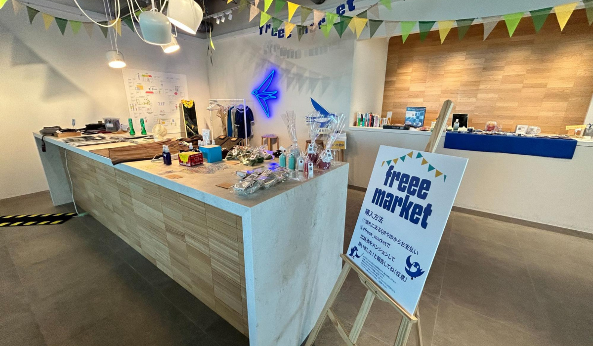 オフィス内で開催される社内フリーマーケット「freee market」では、社員が不用品やハンドメイド作品を持ち寄り、各自でQR決済のアプリIDを貼って自由にやり取りをしています。