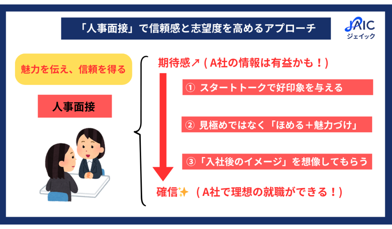 いざ対面で実施する「人事面接」では、把握したUSPを踏まえ、学生の信頼感と志望度を高めるためのアプローチを行っていきます。面接において学生の信頼感と志望度を高めるために有効なアプローチは、次の3つです。
