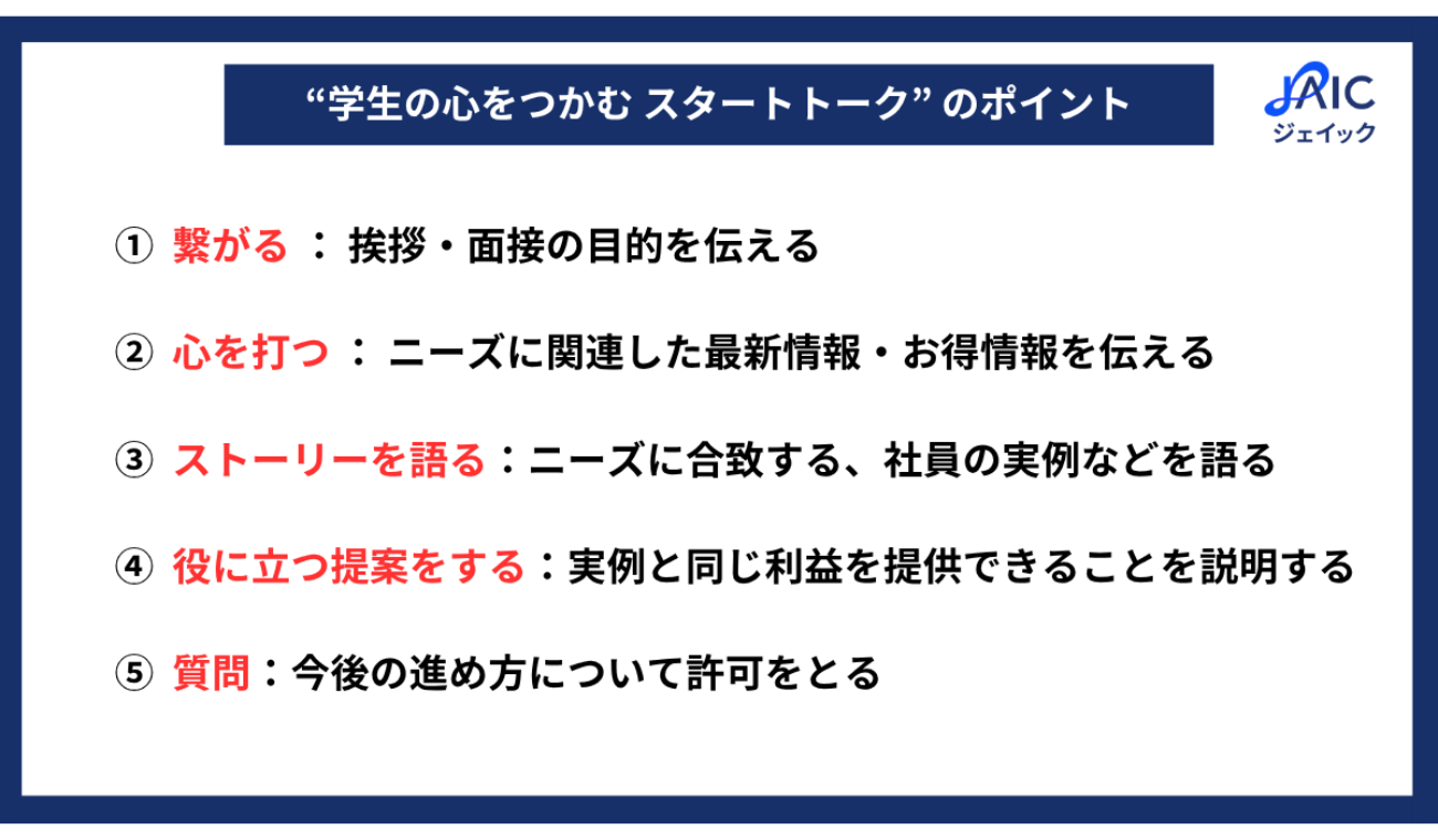 好印象を与えるためには、開始直後にいきなり質問を始めるのではなく、“学生の心をつかむスタートトーク”によって、「自分にとって価値のある情報を採用担当者のAさんは持っていそう」という期待感を醸成することが重要です。“学生の心をつかむスタートトーク”は、主に次の5つの要素で構成します。