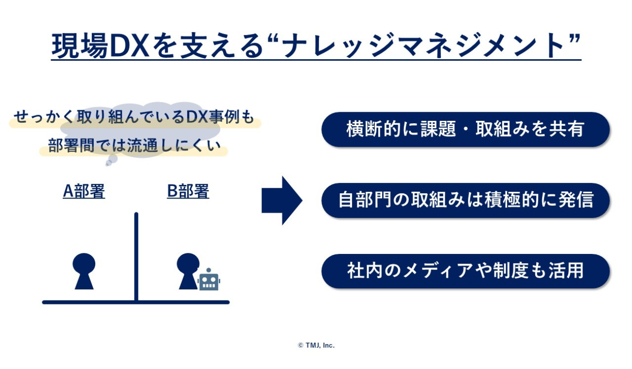 現場には、DXに限らず日々の業務の中で得られた知恵や工夫がたくさんあるはずなのですが、往々にしてそれが個人の中に留まってしまっているという、非常にもったいない状態が散見されます。ナレッジマネジメントの考え方を取り入れ、知識や経験をチーム内で共有する仕組みをぜひ作っていきましょう。
