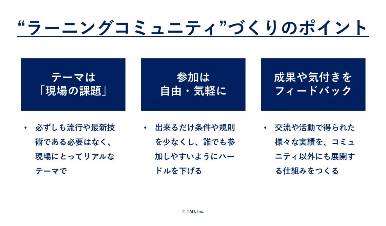 ラーニングコミュニティの運営には、以下のようなポイントがあります。