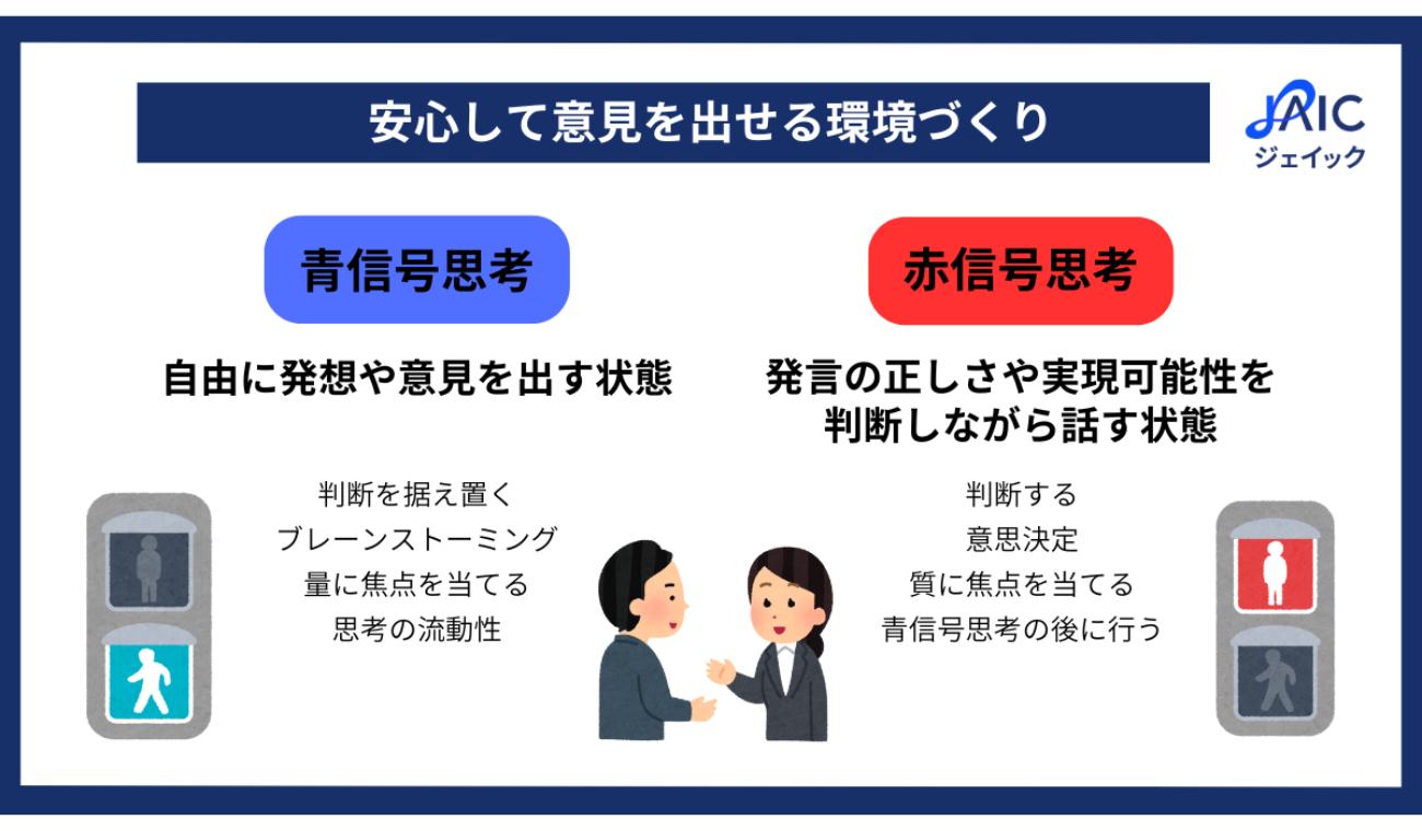 「赤信号思考」とは、発言の正しさや実現可能性をその場で判断しながら話す状態。多くの会議や1on1では、このモードに偏りがちです。一方、「青信号思考」は、自由に発想や意見を出すモードです。