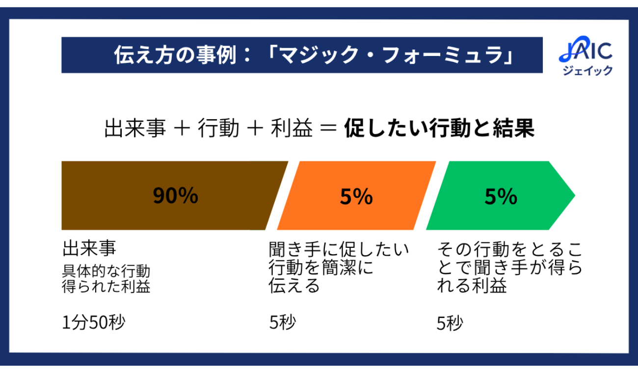 マジック・フォーミュラとは、「出来事(エピソード)90%+してほしい行動5%+得られる利益5%」で構成する話し方です。
