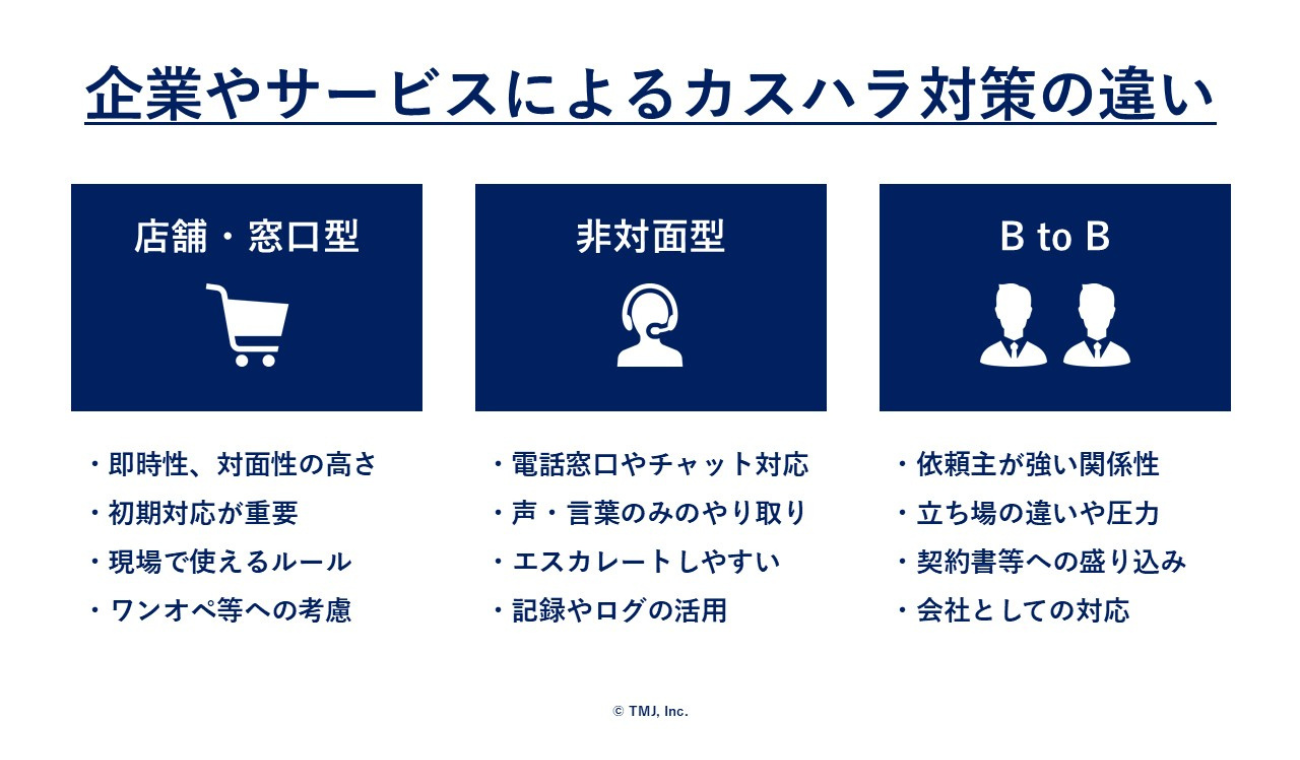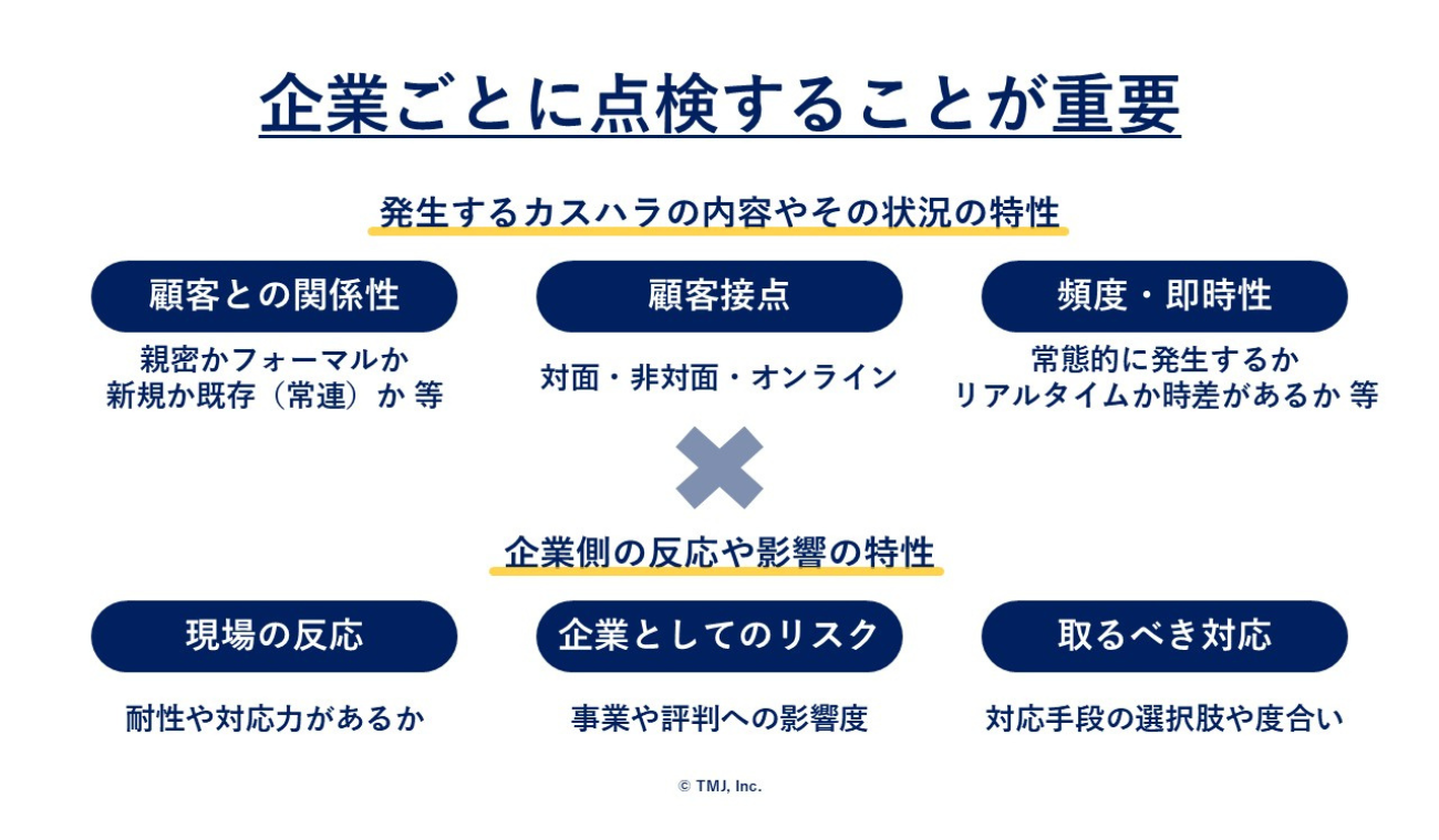 カスハラは、顧客との関係性、接点の持ち方(対面/非対面/オンラインなど)、発生頻度や即時性の有無など、企業やサービス提供のあり方によっても内容や影響度が変わってきます。また、仮に同じようなカスハラに類する言動や事象が発生した場合でも、企業によって現場の受け止め方、企業としてのリスク、取るべき対応は異なってくるでしょう。