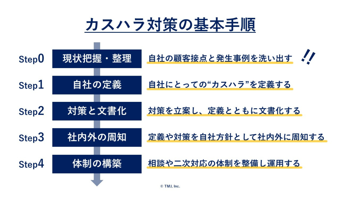 そのうえで、第2回のコラムでもお伝えした対策の基本手順に則り、①自社としてのカスハラの定義、②対策の作成と文書化、③社内外への周知(教育)、④フォロー体制の準備・構築を進めていきましょう。