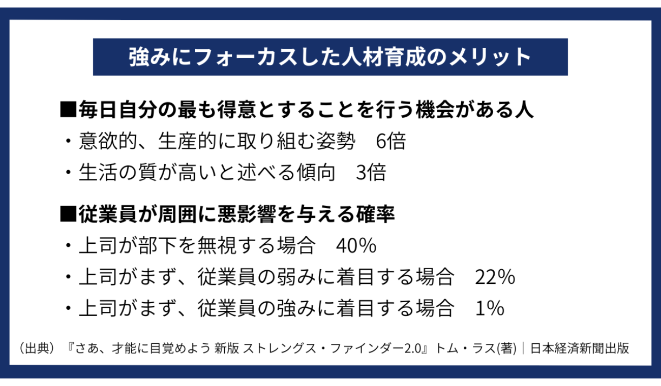 世界的な調査会社であるギャラップ社の研究によると、自分の最も得意なことを毎日行う機会がある人は、そうでない人と比べて6倍も仕事に意欲的かつ生産的に取り組み、さらに「生活の質が高い」と感じる割合も3倍以上に上ることがわかっています。また、人材育成において上司が部下の強みに着目すると、部下が周囲に悪影響を与える確率はわずか1%にまで低下するという結果もあります。