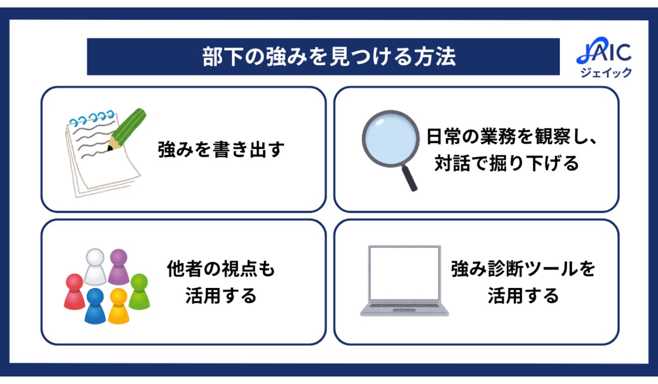 では、具体的に部下の強みを見つける方法を4つご紹介します。取り組めそうなものから実践してみてください。
