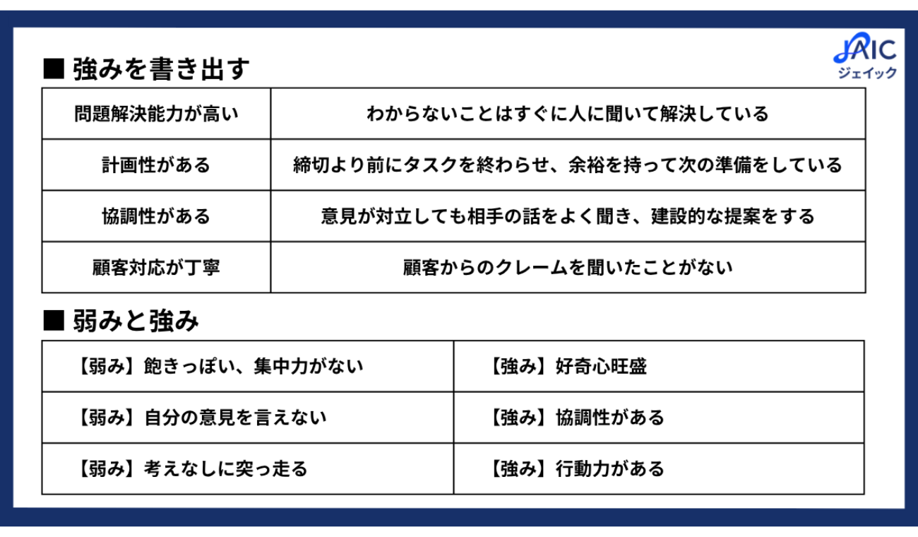 まずは、部下全員の強みを直感的に書き出してみましょう。一人につき3つ程度で構いません。「弱みは出てくるけれど、強みが出てこない……」という方は、思いつく弱みを強みに裏返す方法もおすすめです。弱みと強みは表裏一体です。例えば、細かいことが気になるという弱みを持っている場合、注意深さや丁寧さという強みとしても活きているかもしれません。ネガティブな面をポジティブな観点から再評価することも、強みを見つける手がかりになります。