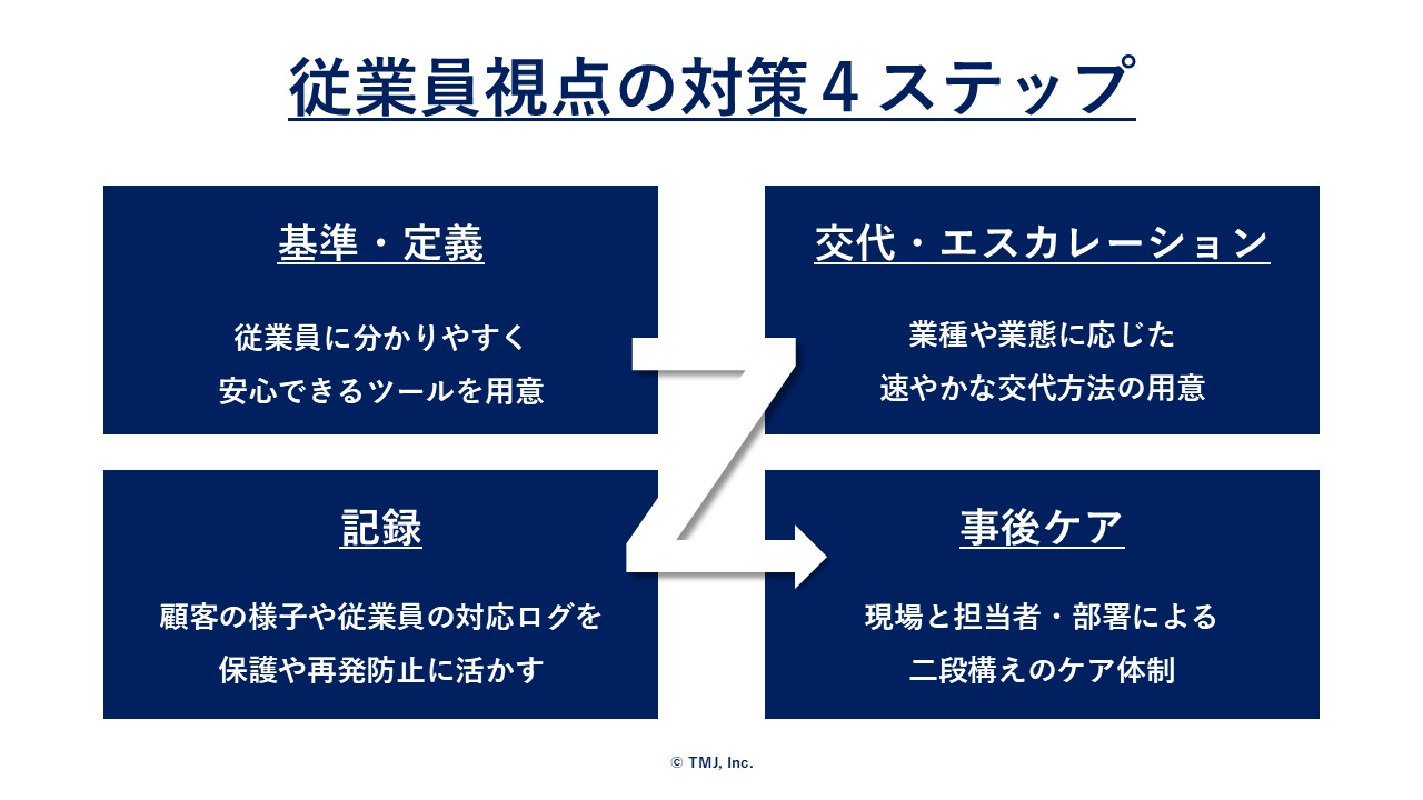 まずは「基準・定義」です。従業員が分かりやすく理解し、判断できるように、例えば言動のレベルと対応方針を早見表にしておくことや、グレーゾーンや迷った場合は速やかな交代を促すことなど、実際の場面での有効性はもちろん、事前の安心感に繋がるようにすることが重要です。