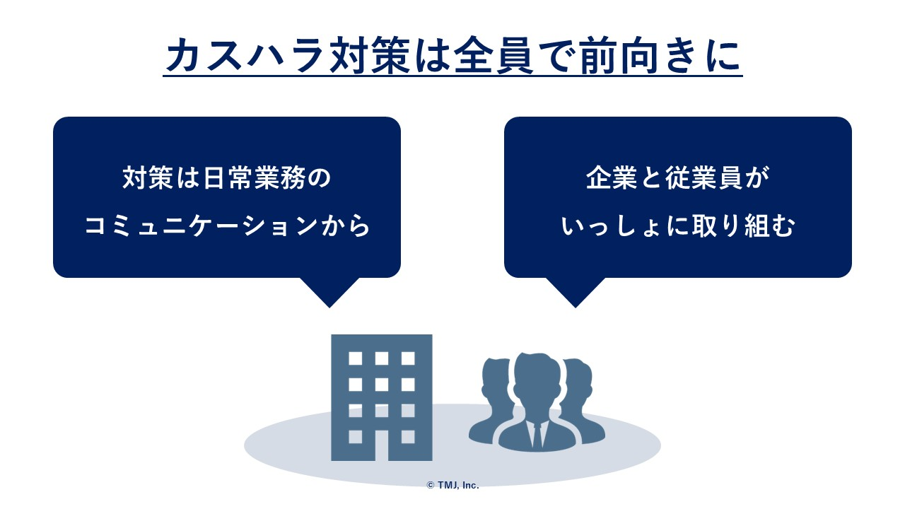ここまでにお伝えしてきたことは、詰まるところ会社における従業員との、あるいは従業員どうしの信頼関係の醸成であることがお分かりいただけると思います。カスハラが発生した場合でも、当事者を「孤立させない」「その人任せにしない」ということを、普段から職場で上司と部下、同僚間で共通認識化しておくことが大切です。