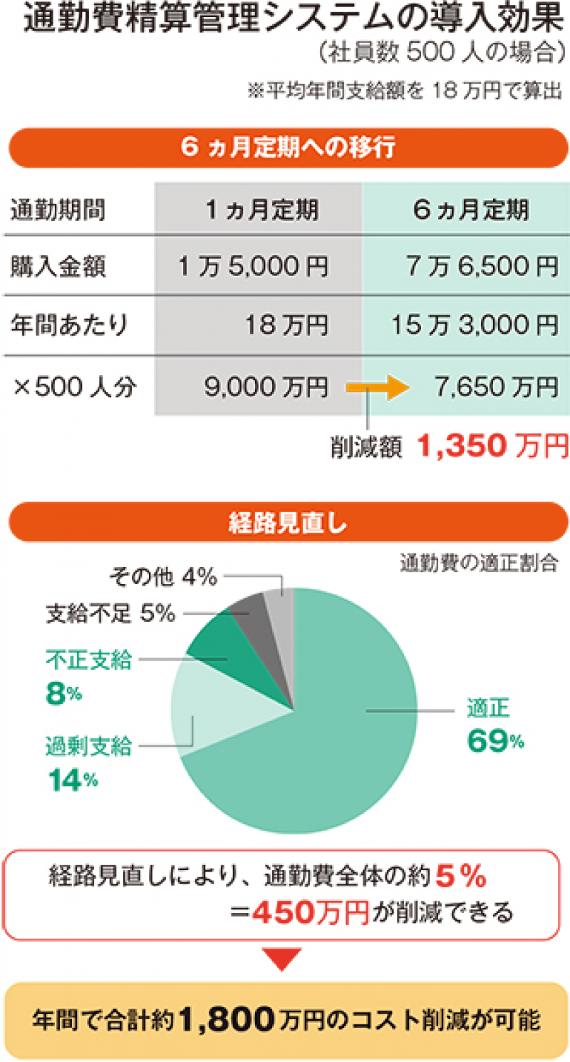 「システムを導入することでさらに大きなコスト削減を期待できるのが、"定期更新"時期の見直しです。異動や転勤が多い企業では、通勤経路の変更に伴う管理業務があまりに複雑なため"1カ月ごとの定期更新"を採用しているケースが多い。これを6カ月定期へと移行するだけで、大幅なコスト削減につながります。通勤費の平均年間支給額は一人あたり18万円といわれていますから、社員500人規模の組織で6カ月定期に切り替えた場合、年間の削減効果は1350万円。これに経路見直しによる5%の削減効果を合わせると、1800万円にも上ります。毎年継続して1800万円の利益を出すことは容易ではありませんが、通勤費管理をシステム化するだけで、毎年多額の損失を防げるようになるのです」(清水氏)