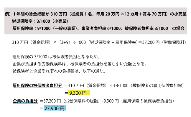 労働保険料は、従業員に支払う「賃金総額」に保険料率(労災保険率+雇用保険率)を乗じて求める。例をもとに計算してみよう。