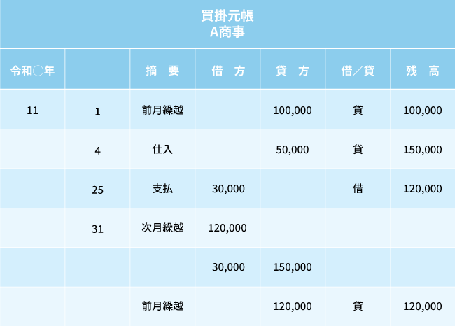 11月4日に50,000円の商品を掛取引で仕入れているので、貸方に「50,000」と記載し、残高を「150,000」とする。11月25日に買掛金のうち30,000円を支払ったので、貸方に「30,000」を計上し、残高を「120,000」に減らす。取引内容は日ごとに記載しておき、月末に繰越として残額を記帳しよう。