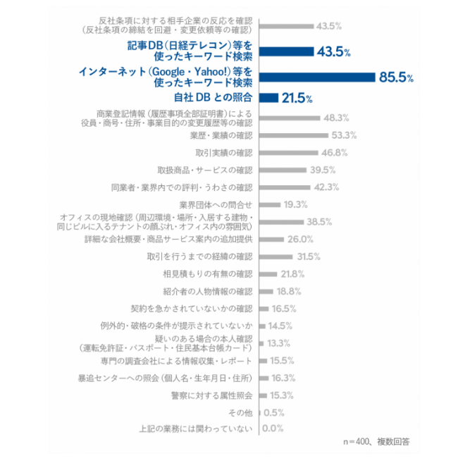 一方、社会のガバナンスに対する意識の高まりにより、企業活動におけるリスクチェックの重要度が増している。近年では、反社会的勢力だけでなく、人権問題やマネーロンダリングなど企業を脅かすリスクの多様化とESGへの関心の高まりから、さまざまな評価軸によって、企業の信頼性が評価されるようになっている。