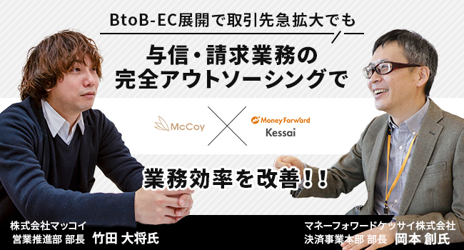 BtoB-ECへの取り組み内容についてマッコイの営業推進部 部長 竹田 大将氏と、マネーフォワードケッサイ 決済事業本部 部長 岡本 創氏にお話を伺った。
