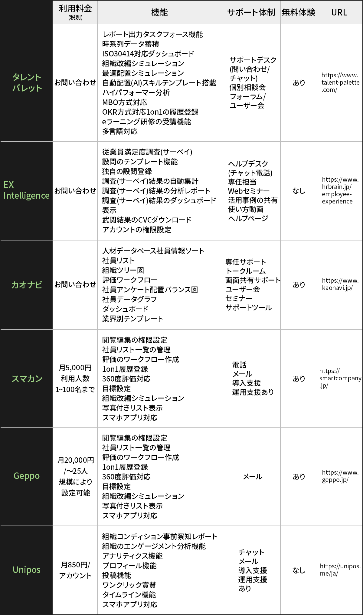 ここでは、主要なモチベーション管理システム6つを利用金額、機能、サポート体制、無料体験の有無の項目ごとに比較していく。公式サイトのURLも添付しているので、気になるサービス公式サイトで確認してほしい。