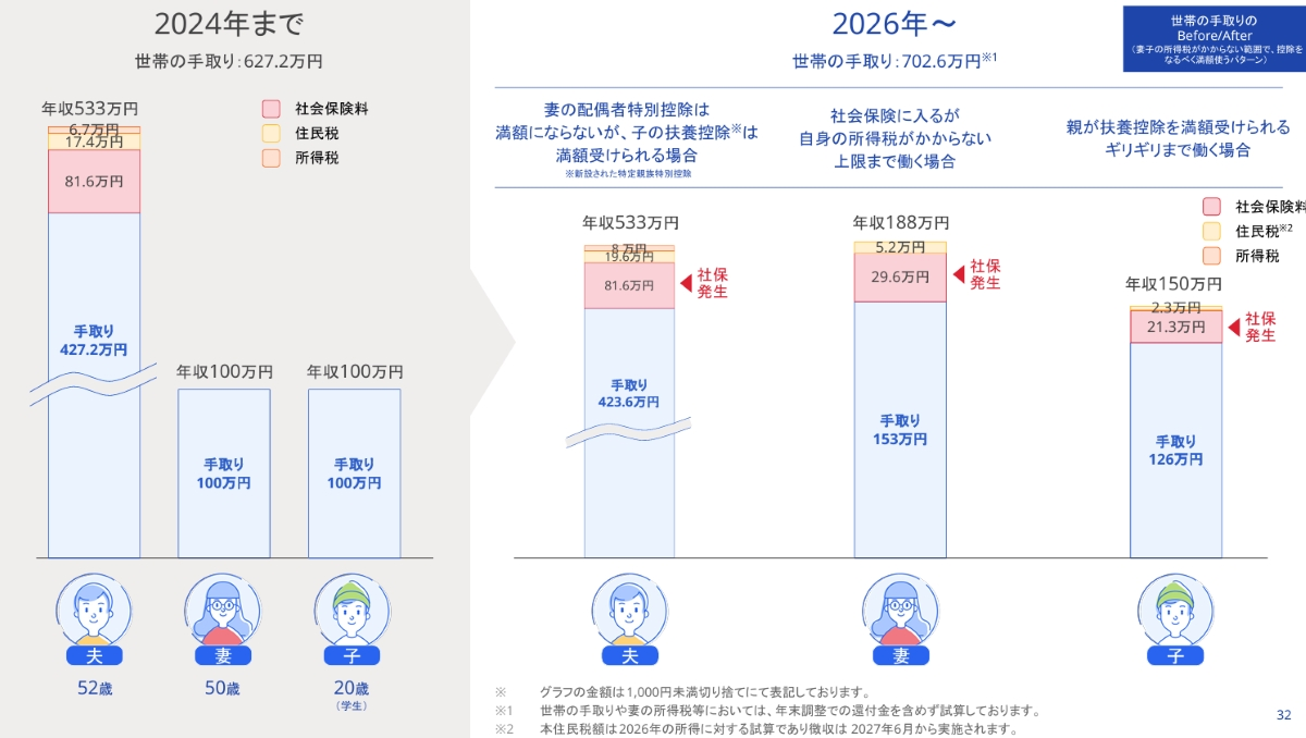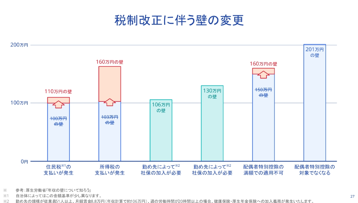 住民税の支払いが発生する年収ラインが100万円から110万円になるのは、2026年からだ。これは住民税の計算が前年の所得をベースに計算することによる。注目すべきは「103万円の壁」が一気に「160万円の壁」へと大幅に高くなることであり、勉強会でもこの部分について厚く解説が行われた。