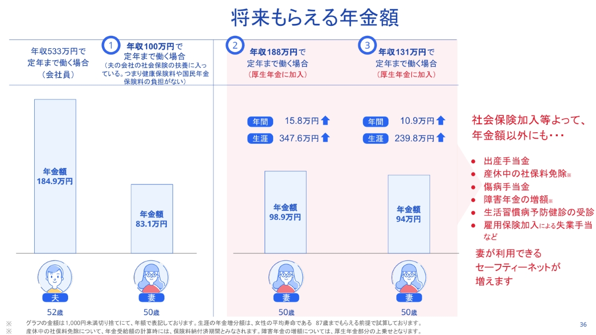 また、社会保険に加入するメリットは年金にとどまらない。出産時の「出産手当金」、病気やケガで休業したときの「傷病手当金」、失業したときの「失業手当」など、利用できるセーフティーネットが増える。「今の手取り額を増やすか、将来もらえる額を増やすか。どちらを取りたいかで働き方を決めるのが重要です」と小泉氏は解説した。