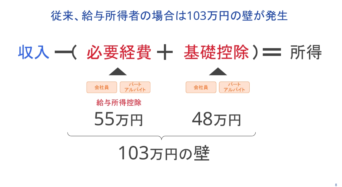 なかでも給与所得者が収入から差し引けるのが「給与所得控除」だ。これまで、年収162万5000円以下の場合は給与所得控除が55万円だった。また、収入のある人は誰でも差し引ける「基礎控除」が、年間所得2500万円以下であれば48万円であったことから、収入が「55万円+48万円=103万円」を超えると、超えた金額が所得税の対象になっていた。