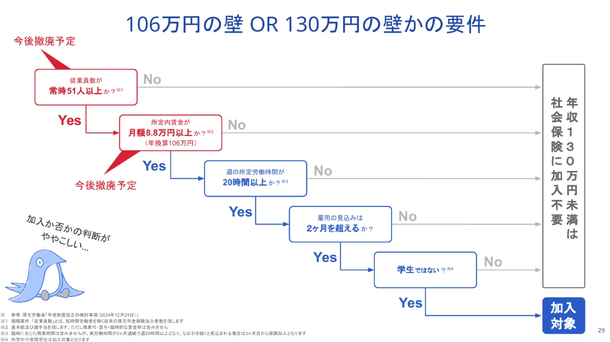 106万円の壁は、条件によって社会保険の加入が必要になる収入ラインだ。「従業員が常時51人以上の企業等」「所定内賃金が月額8.8万円以上」「週の所定労働時間が20時間以上」「雇用の見込みが2カ月を超える」「学生ではない」の5つの条件を満たすと、社会保険の加入対象となる。