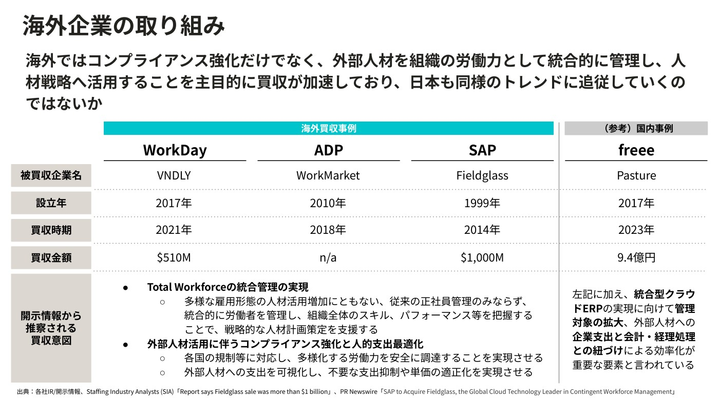海外では2010年代からベンダーマネジメント市場が成熟し、WorkdayやSAPなどの大手HR企業が相次いでフリーランス管理サービスとのM&Aを進めてきた。正社員を中心としたタレントマネジメントだけでは、多様化した働き方をする外部人材を一元管理するのが難しいためだ。