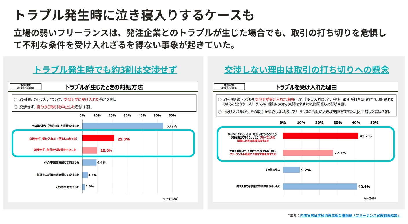 一方で、発注時に報酬や業務内容が明示されない、支払いが期日に行われないといったトラブルが急増し、2020年に行われた政府の調査では37.7%のフリーランスが何らかの紛争を経験。立場の弱さから3割が泣き寝入りを余儀なくされていた。