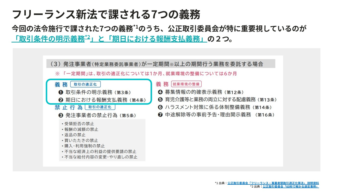新法は大きく「取引の適正化」と「就業環境の整備」に関わる7つの義務・禁止行為を定めている。とりわけ公正取引委員会が重視するのは「取引条件の明⽰義務」と「期⽇における報酬⽀払義務」の2つだ。