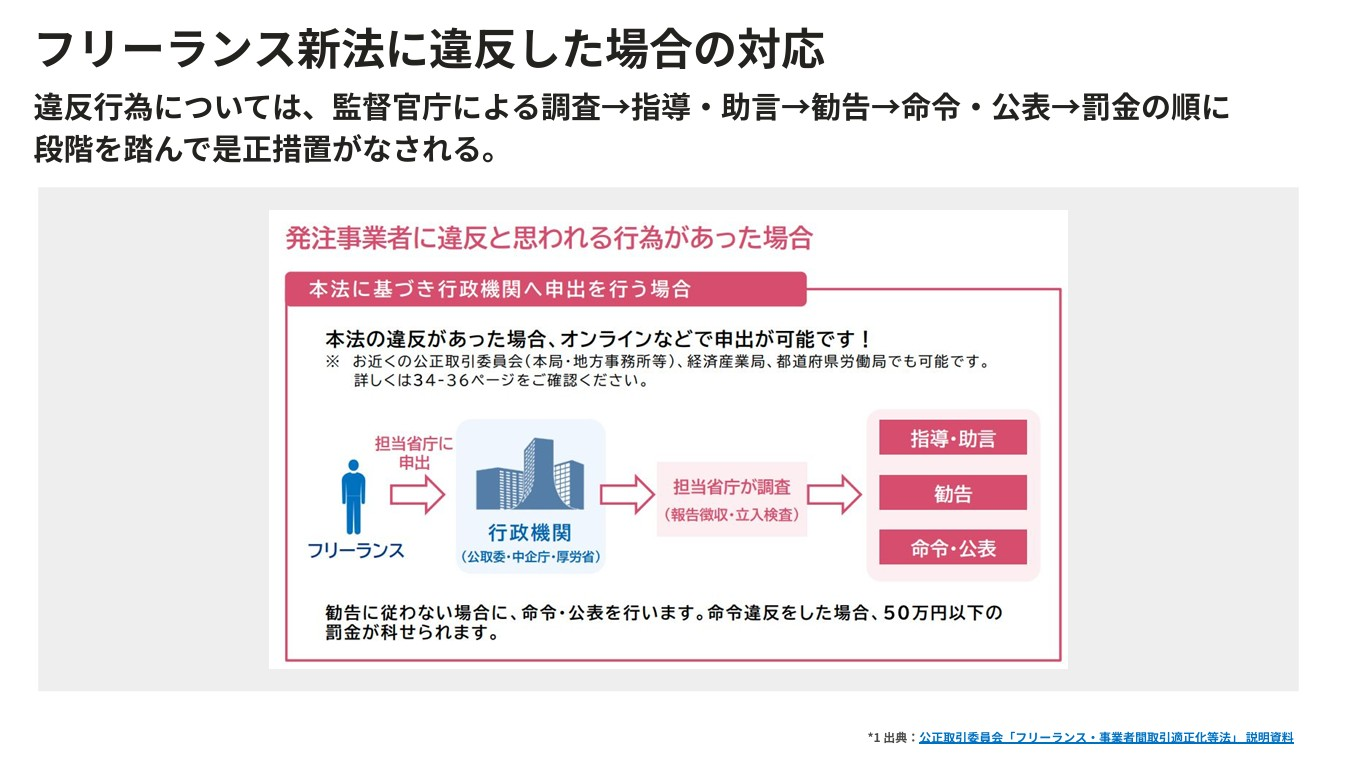 違反が疑われる場合には、調査→指導・助言→勧告→命令・公表→50万円以下の罰金という段階的措置が取られる。