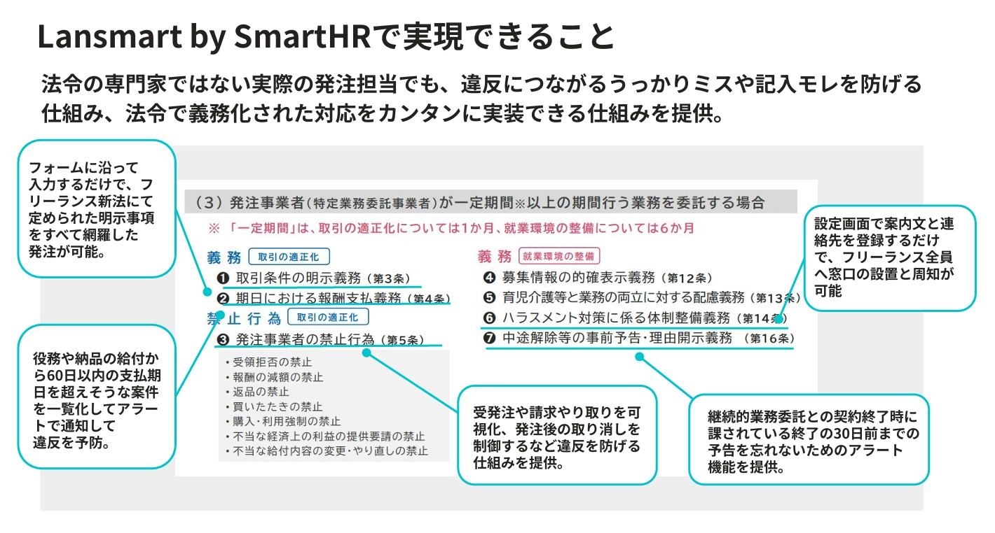 例えば、取引条件の明示については、フォームへの入力だけで必要7項目を網羅した発注書をすぐ生成できる。報酬の支払いについては、役務や納品の給付から60⽇以内の⽀払期⽇を超えそうな案件を⼀覧化し、アラートで通知して違反を予防する機能がある。なお、「Lansmart by SmartHR」は法令遵守対応と同時に帳票作成・消費税・源泉徴収計算・会計連携などもシステム上で行えるため、業務効率化も実現できるのが強みだ。