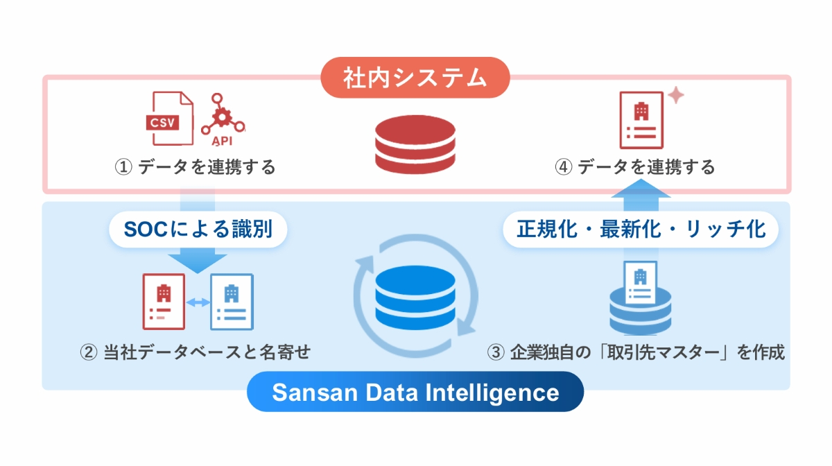 次に紹介されたのが、データクオリティマネジメントサービス「Sansan Data Intelligence」だ。Sansanの調査では、AIと社内データを連係している企業が約9割に達するものの、重複登録や古い情報が残っているなどして、87.3%の企業が「期待通りの精度は出ていない」と回答。Sansan Data Intelligenceは社内に散らばる顧客データを統合し、重複や表記揺れを解消、常に最新で正確な状態に保つ。800万件を超える企業データベースと2000種以上の独自フラグを活用すれば、取引先の分析や営業戦略の検討に役立つような顧客データが得られるようになる。