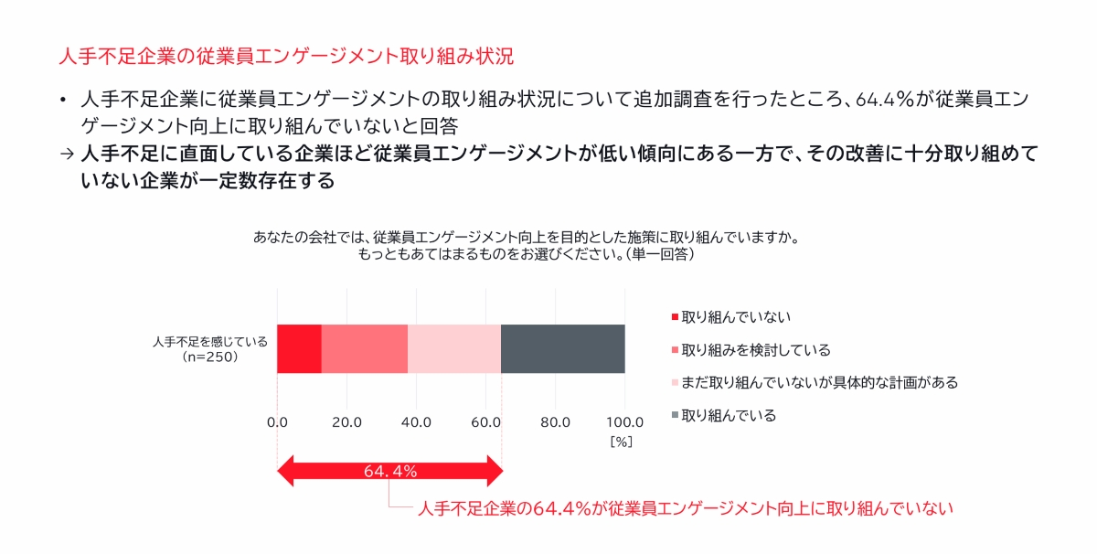 荒川氏は、「人手不足を実感している企業ほど、実際にはエンゲージメント向上への取り組みが進んでいないというジレンマがある」と指摘した。人手不足への対応を「人員の補充(数)」だけで捉えるのではなく、既存従業員の働きがいを高めることで「離職の防止と生産性の向上(質)」につなげる。これが構造的な人手不足に対する本質的な解決策であるという見解を示した。