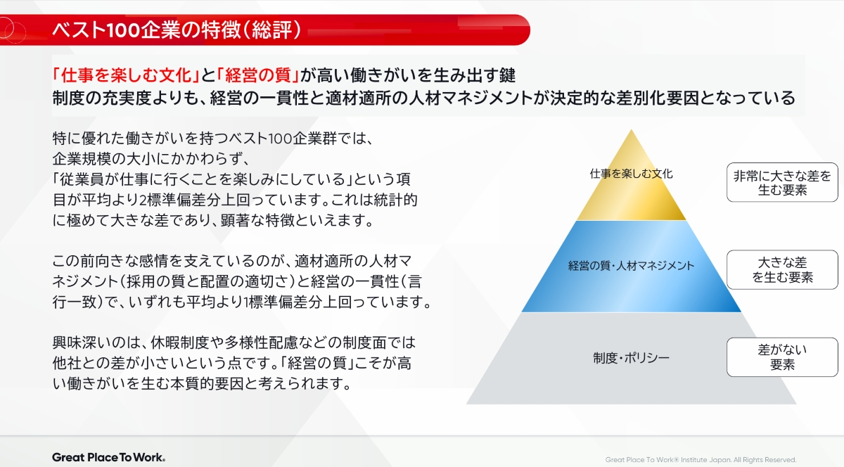 続いて、ランキングの傾向分析から、優れた働きがいを持つ「ベスト100企業」と、一定基準を満たした「認定企業」を分ける要因が示された。
