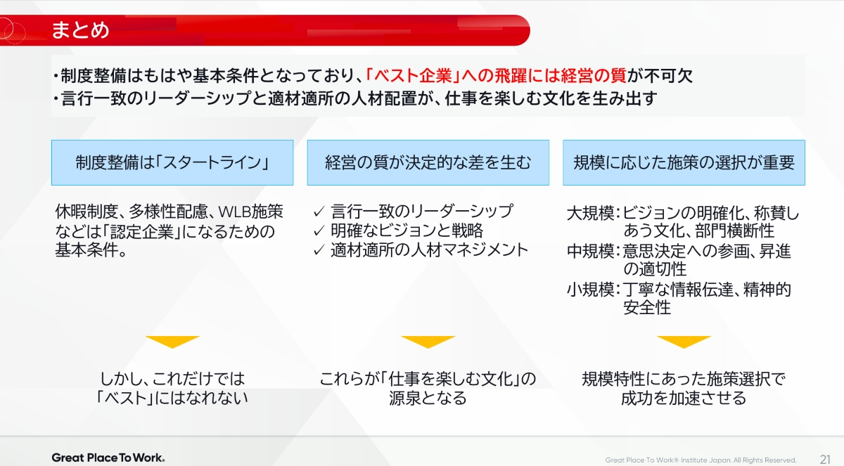 GPTWが実施した統計分析によると、休暇制度、福利厚生、多様性への配慮といった「制度面」の充実度においては、ベスト100企業と認定企業の間に有意な差は見られなかった。つまり、労働条件の整備はすでに「働きがい」を構築する上での基本要件(スタートライン)となっており、それだけで他社と差別化することは困難であることを示唆している。