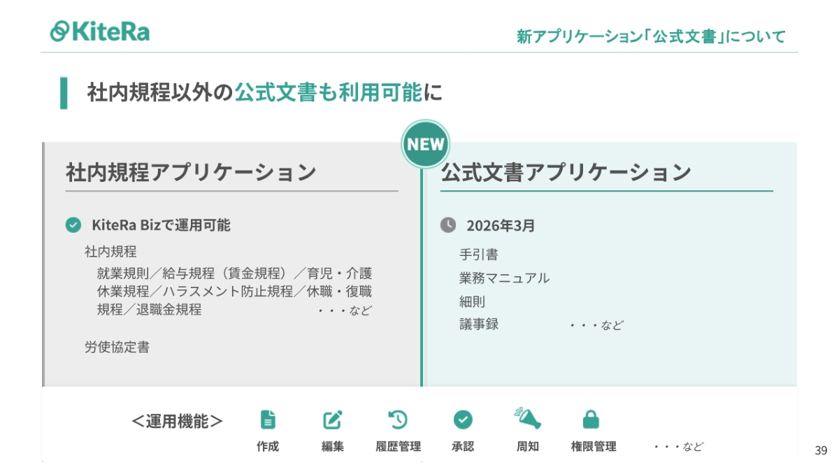 説明会では再び植松氏が登壇し、2026年3月から提供を開始する新アプリ「公式文書」について解説した。「公式文書」では、社内規程だけでなく、ポリシー、ガイドライン、手順書、マニュアル、細則など、これまで散在していた文書を一元管理し、最新版管理・履歴管理・承認・周知までをシステム上で完結させる。