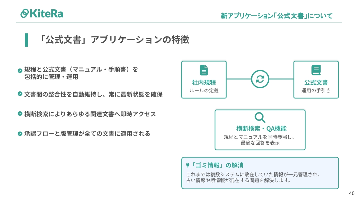 KiteRaは業務アプリケーション内に最新データを保持し、AIを活用して規程と運用の同期を維持する仕組みを提供することで、この構造的課題を解決しようとしている。