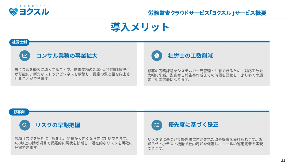 「ヨクスル」は、450を超える診断項目に基づき、労務リスクを定量的に可視化できる労務監査クラウドサービスだ。株式会社全国労務診断協会の今田真吾代表取締役は、「どんないい企業でも土台となる労務の部分がきちんとできていないと、エンゲージメントが上がりません。働き方が多様化する中、法規制も改正されています。我々の『ヨクスル』で雇用環境の課題を見える化し、社内規程を改善したうえで、KiteRaのツールによりその規程を確実に運用することで、企業のガバナンス高度化に貢献できます」とグループ化参画の狙いを語った。