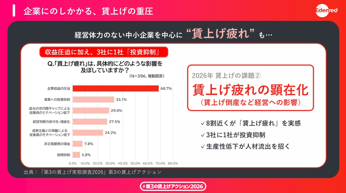 物価高が続く中、企業は「賃上げしなければ採用できない」という現実に直面している。しかし、現金給与だけで従業員の生活を支えるのは、もはや限界が見え始めている。最近では、経営体力のない中小企業を中心に「賃上げ疲れ」が顕在化し、3社に1社が投資を抑制しているという。