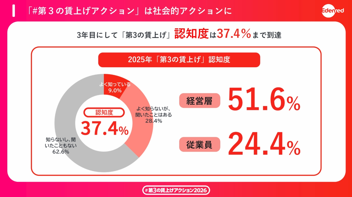 2024年の立ち上げ当初、賛同企業はわずか20社。そこから3年で認知度は37.4%に到達し、メディア露出は前年比5倍、エデンレッドジャパンが展開する福利厚生サービス「チケットレストラン」の新規契約数は2021年比で約13倍に伸びた。