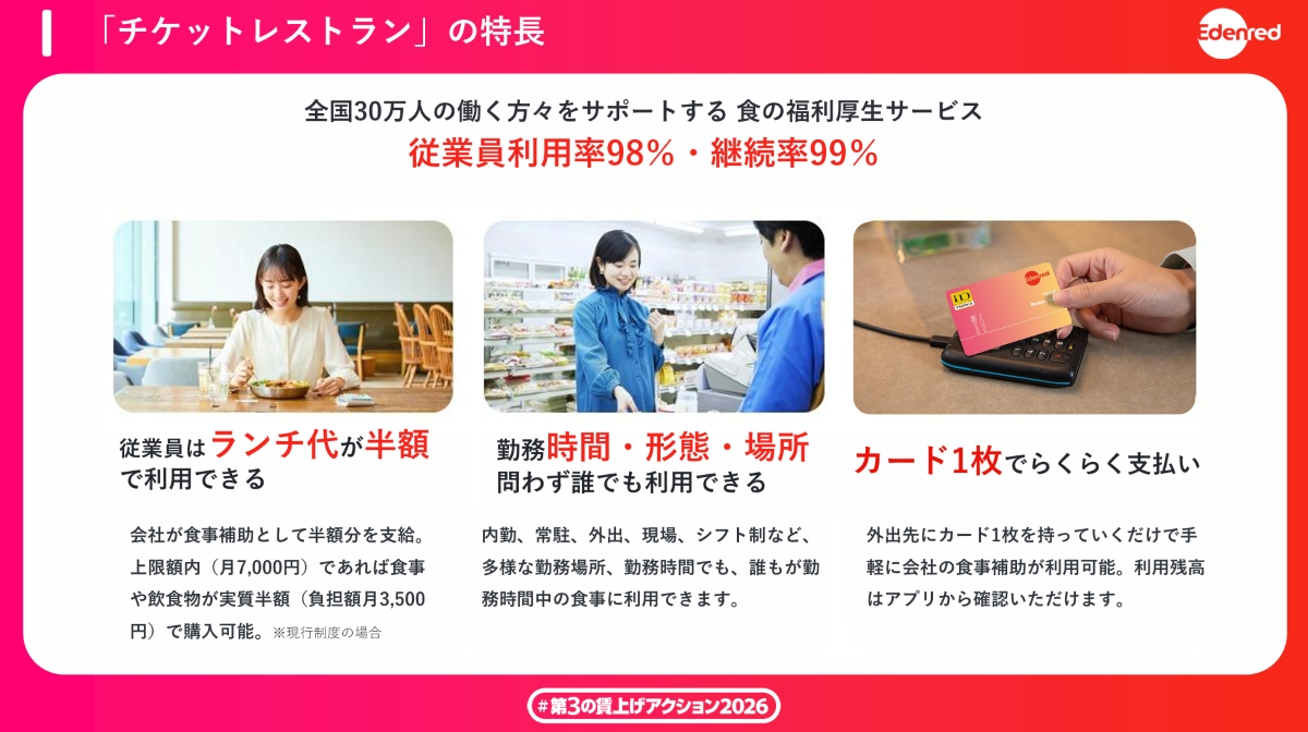 エデンレッドジャパンの「チケットレストラン」は、全国25万店舗以上で使える食の福利厚生サービスだ。ICカード1枚でコンビニや飲食店を社員食堂のように利用でき、企業が食事補助として半額分を負担する。導入企業は4000社超、利用者は30万人を超える。