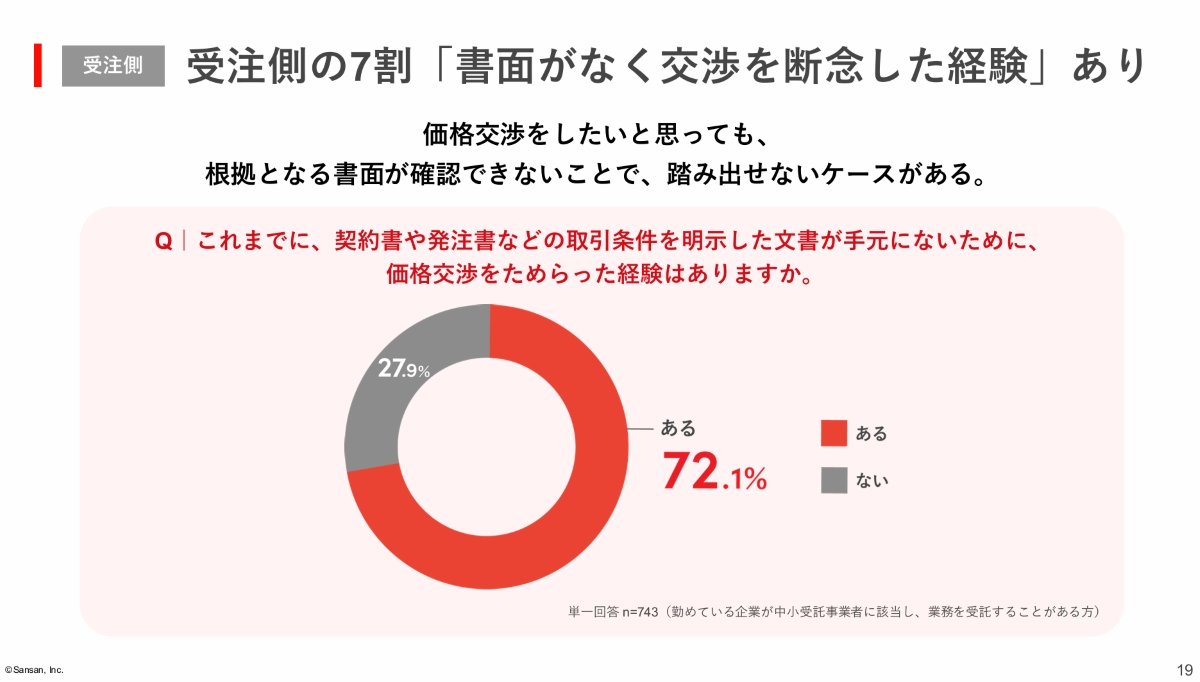 なお、受注者の72.1%が「契約書が手元になく交渉をためらった」と回答している。契約管理の不備が、価格転嫁を阻害していることを示唆する内容となった。