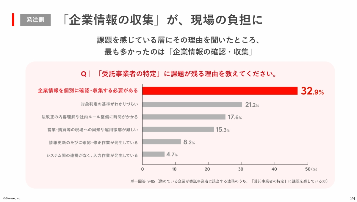 一方、発注者側に対して、受託事業者の特定に対応できているかを尋ねたところ、「課題がある」と答えた層が6割程度となった。さらに、課題を感じている層に理由を尋ねたところ、最も多かったのは企業情報の確認収集であり、手作業での情報収集が現場の負担になっていることが明らかになった。