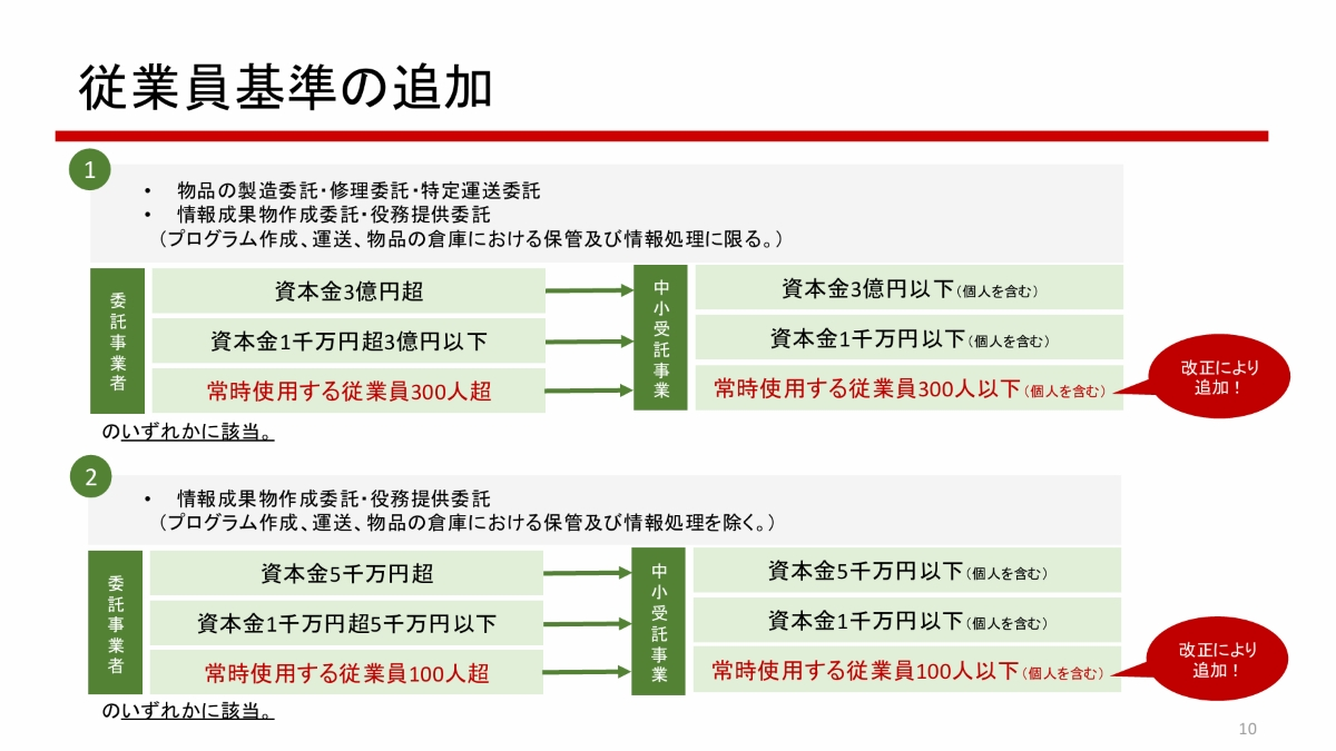 改正により、適用対象となる取引や事業者の範囲が拡大され、中小受託取引の公正化と受託側の中小企業の利益保護が強化された。つまり、中小企業が不利な取引条件を押しつけられないように、よりいっそう制度が見直された形である。