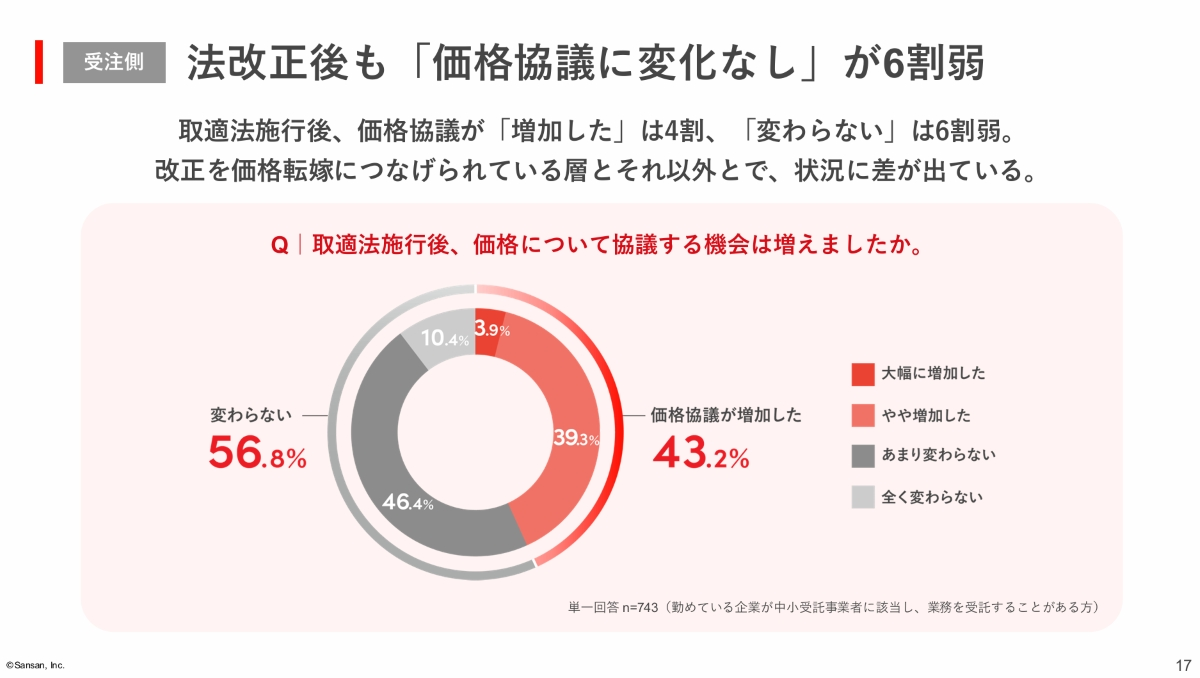 受注者に対し、取適法施行後に価格協議が増加したかを尋ねたところ、「増加した」と回答した割合は43.2%。大泊氏は「法改正を価格転嫁のきっかけにつなげられている企業とそうでない企業とで、対応に差が出ている現状がわかります」と指摘した。