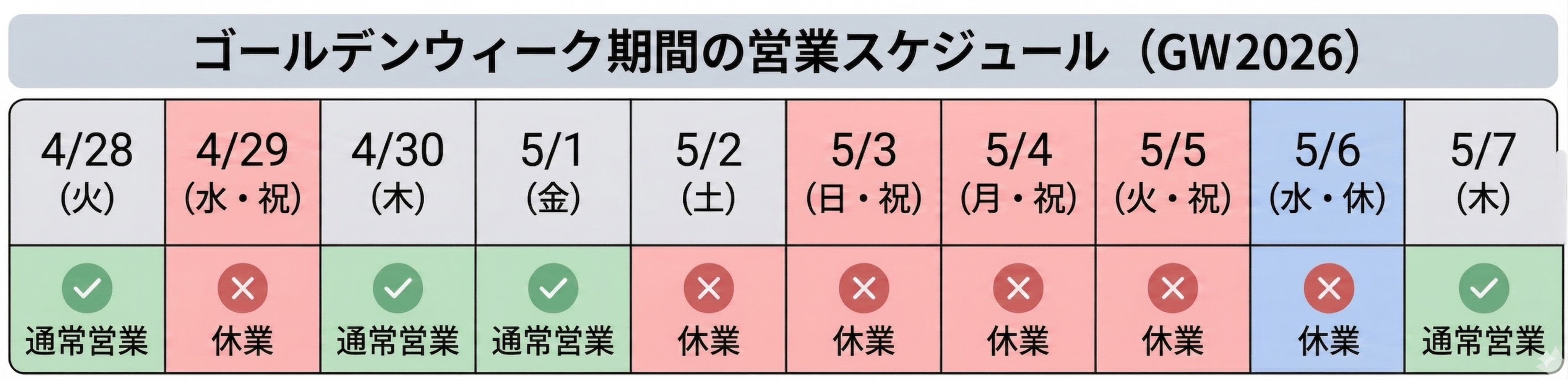 多くの銀行において、窓口営業は4月29日(水・祝)、5月2日(土)~5月6日(水・振替休日)が休業となります。通常営業となるのは5月7日(木)からです。4月28日(火)、4月30日(木)、5月1日(金)、5月7日(木)は混雑が予想されます。