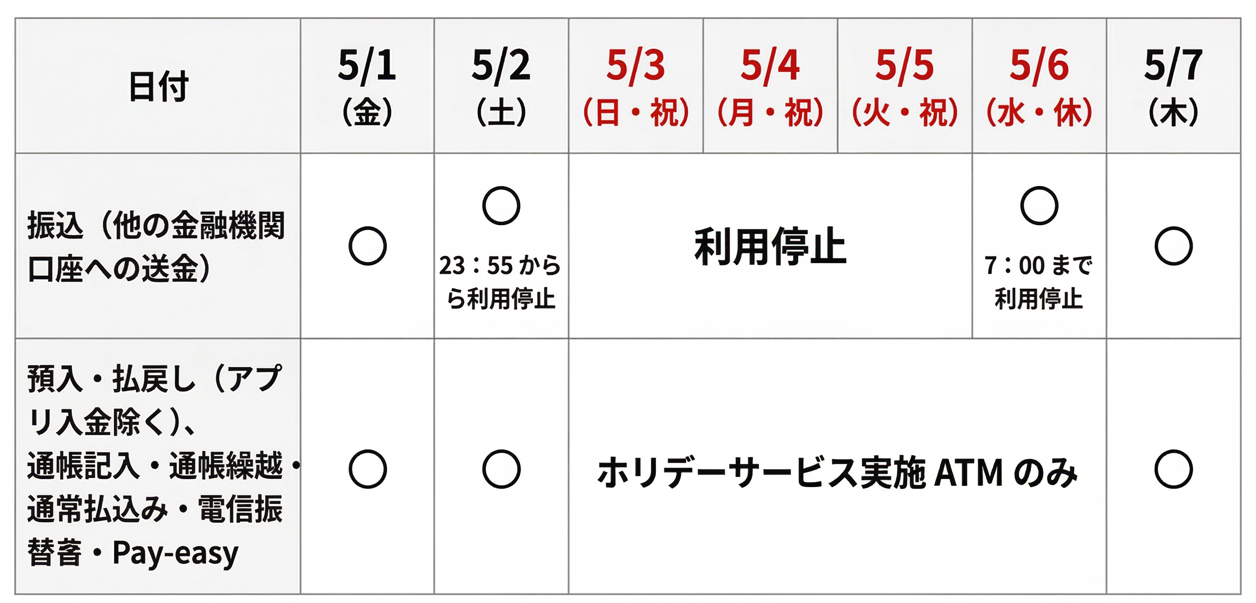 2026年度 ゴールデンウィーク営業のご案内(みずほ銀行)