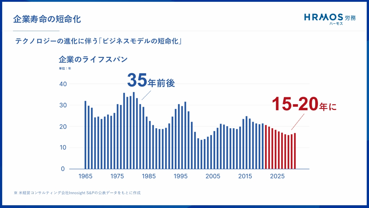 発表会冒頭では代表取締役社長の酒井哲也氏が登壇し、新サービス提供の背景を説明した。昨今では、テクノロジーの進化に伴ってビジネスモデルが短命化し、企業のライフスパンが急激に短くなってきている。酒井社長は「労働人口の減少に事業変化のスピードが重なることで、企業にとって『人を採る』だけでなく『人を生かす』ことが経営課題になっている」と強調した。