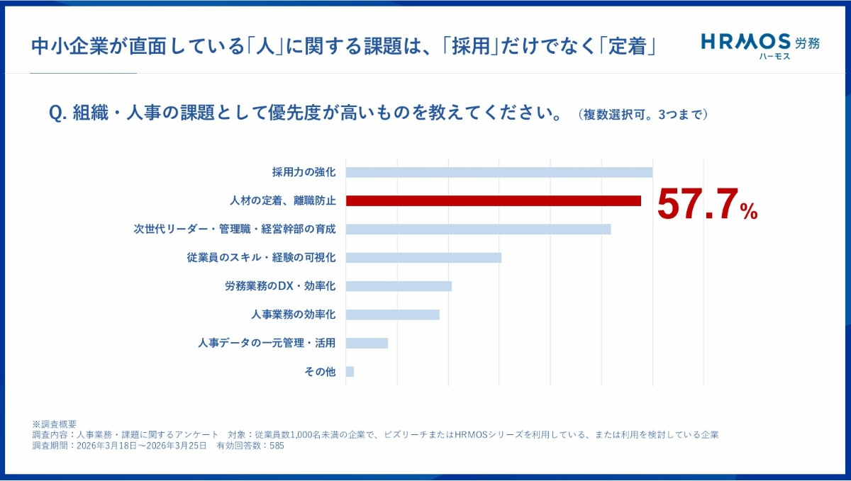 採用難が続く中、せっかく採用した人材がすぐ辞めてしまう——。ビズリーチが2026年4月9日に正式リリースした「HRMOS(ハーモス)労務」は、採用管理と労務管理を一気通貫でつなぎ、「入社後の定着」という長年の課題に正面から挑む新サービスだ。同日に行われた記者発表会では、「HRMOS労務」提供の背景と、サービス内容の解説が行われた。